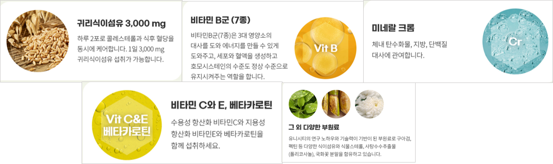 귀리식이섬유 함량을 더욱 높여 식후 혈당과 콜레스테롤 수치를 동시에 관리해 줍니다.